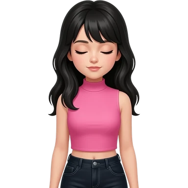 Teenage girl with long black hair wearing a pink sleeveless turtleneck top and long black jeans with her eyes closed and looking down emoji
