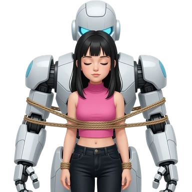 Teenage girl with long black hair wearing a pink sleeveless turtleneck top and long black jeans with her eyes closed and looking down and tied to a giant robot's body emoji