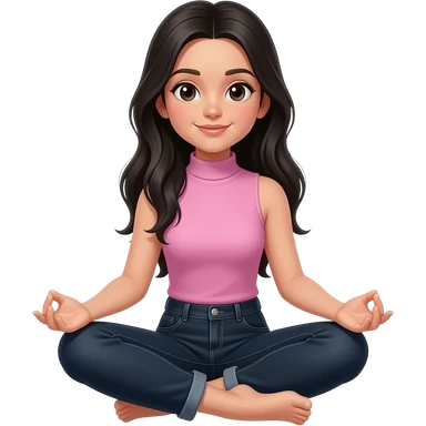 Teenage girl with long black hair wearing a pink sleeveless turtleneck top and long black jeans meditating emoji
