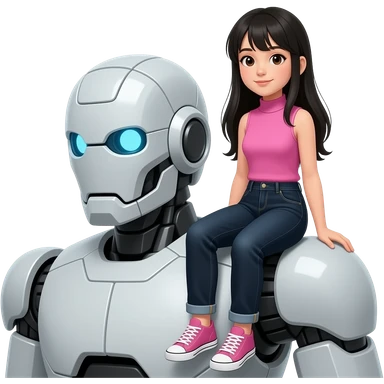 Teenage girl with long black hair wearing a pink sleeveless turtleneck top and long black jeans sitying on a giant robot's shoulders emoji