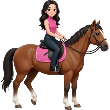 Teenage girl with long black hair wearing a pink sleeveless turtleneck top and long black jeans riding a horse emoji