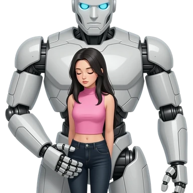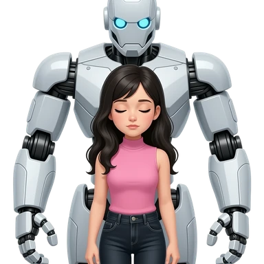 Teenage girl with long black hair wearing a pink sleeveless turtleneck top and long black jeans with her eyes closed and looking down and kidnapped by a giant robot emoji