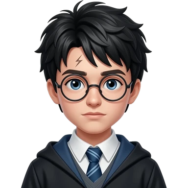 teenage wizard boy, 18-19 years old, messy uneven black hair, round glasses, thin lightning-shaped scar on forehead, serious focused expression, wearing dark school robe and tie, gold and red colors, head-and-shoulders portrait, centered, 3D glossy emoji style, clean background emoji | AI Emoji Generator