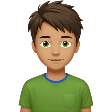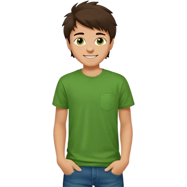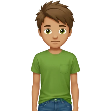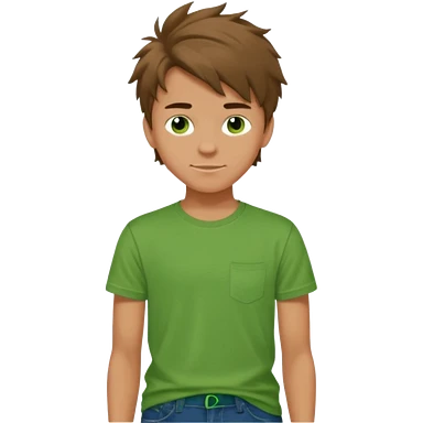 A 14 yerar old teenage boy, slightly tanned, wearing a green tshirt (no shirt pocket), blue jeans and green sneakers with brown tousled hair, smirking emoji