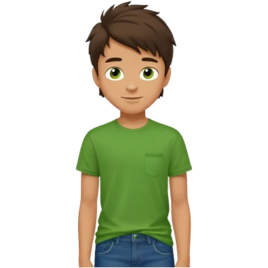 A 14 yerar old teenage boy, slightly tanned, wearing a green t-shirt , blue jeans and green sneakers with dark brown tousled hair, smirking emoji