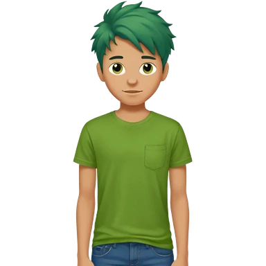 A 14 yerar old teenage boy, slightly tanned, wearing a green tshirt (no pocket), blue jeans and green sneakers with brown tousled hair, smirking emoji