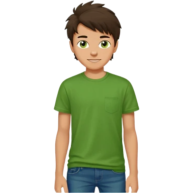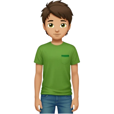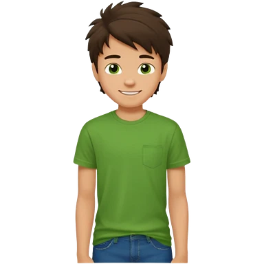 A 14 yerar old teenage boy, tanned, wearing a green t-shirt , blue jeans and green sneakers with dark brown tousled hair, smirking emoji
