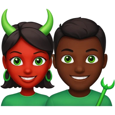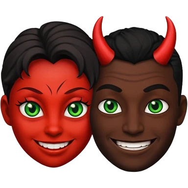 two evil persons (male and female) with devilish smile and black face and green eyes emoji