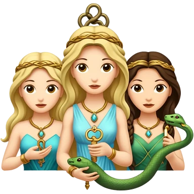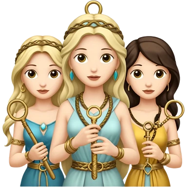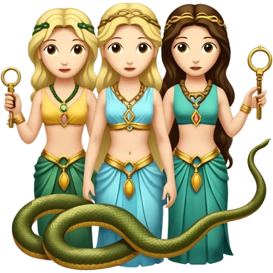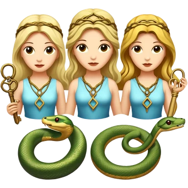 Three goddesses. one with a snake facing right, one with a key facing left, one in the center with a key emoji