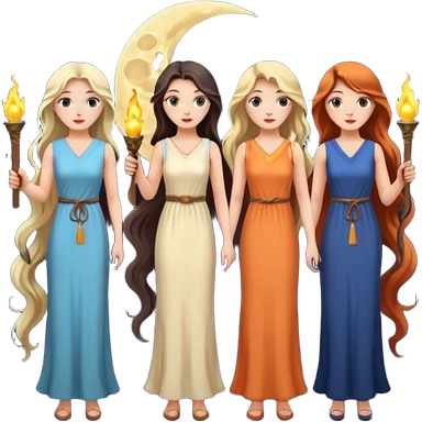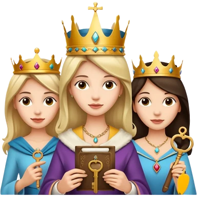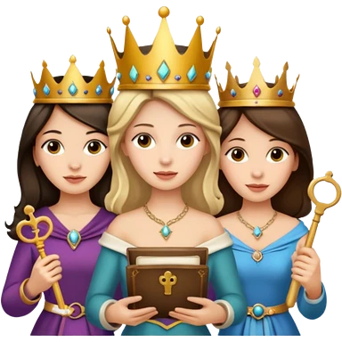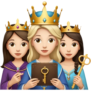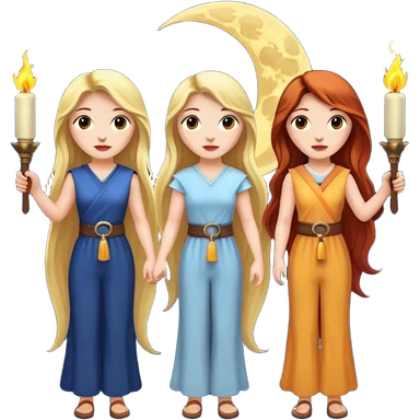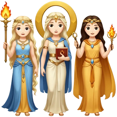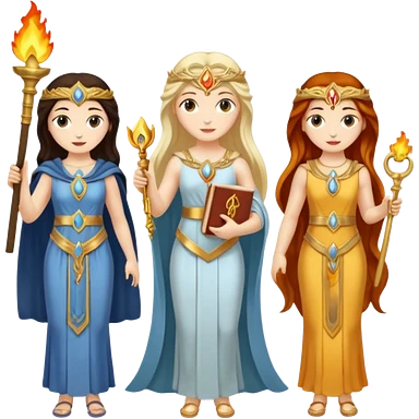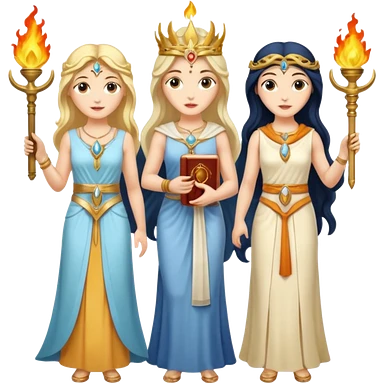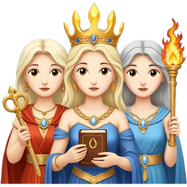 Three goddesses. one with a key, one with a torch, one with a book and a moon on it. emoji
