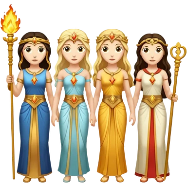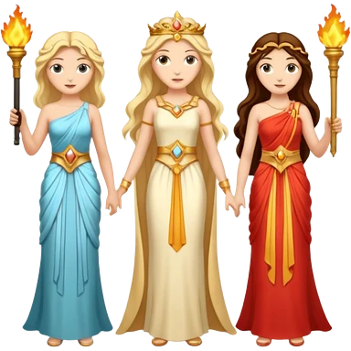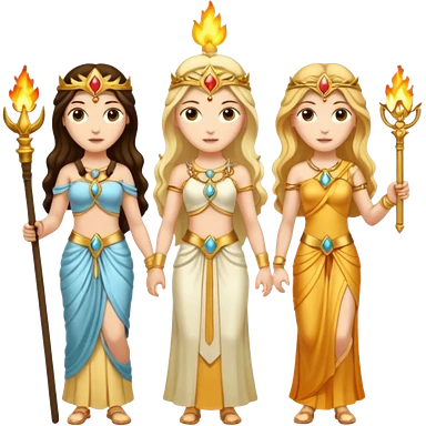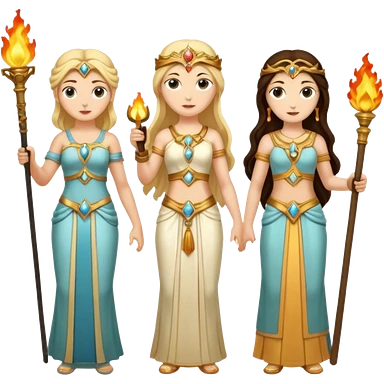 Three goddesses. one with a torch facing right, one with a torch facing left, one in the center with a key. emoji