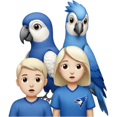 two children, one tall girl and one little boy and a white parrot watching blue jays game, with look of horror on their face emoji