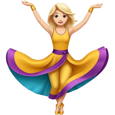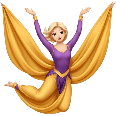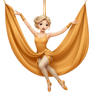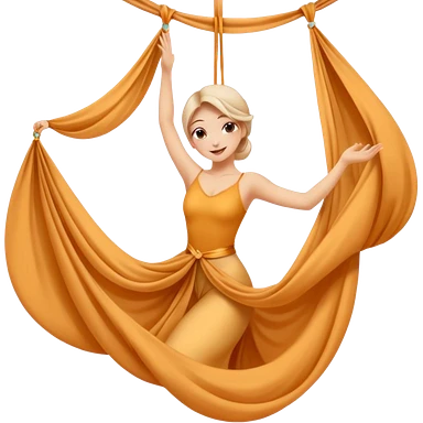 Emoji estilo ilustración de una mujer practicando danza aérea en tela, colgada en telas de seda, pose elegante, expresión feliz, estilo emoji moderno, colores suaves, fondo simple emoji