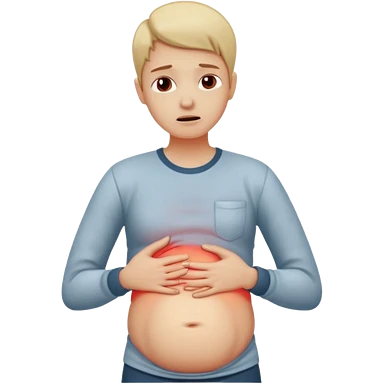 A person wearing casual clothes, holding their stomach with one hand, showing visible discomfort. A red glow appears over the abdominal area to indicate pain. Realistic medical illustration style, clean white background, focus on body language expressing stomach ache or cramps. emoji