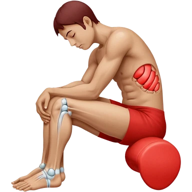 A person sitting and holding their knee, showing pain or inflammation. A red area highlights the joint to indicate soreness. Realistic photography style with clear detail on hands, knee, and muscle tension, plain white background for medical illustration use. emoji
