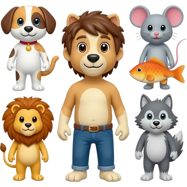 A cartoon figure standing up and looking at us, shaped like a mix of all these animals: a dog, a cat, a mouse, a lion, a fish, and a wolf. emoji