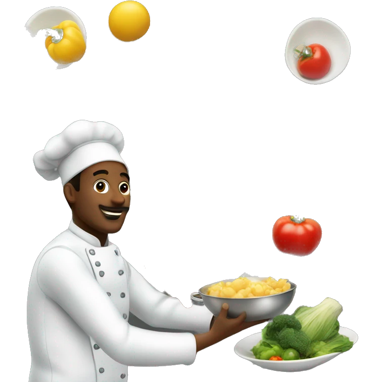 the cook is cooking, vegetables and fruits are flying above him and near him emoji | AI Emoji Generator