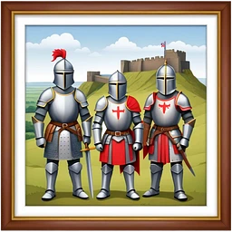 historical reenactment scene with knights in armor standing near Hadrian's Wall, emphasizing the division between Scotland and England. emoji