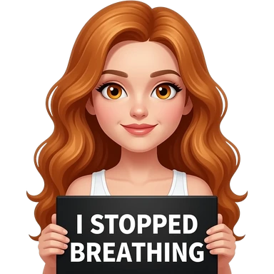 sexy girl with long wavy ginger hair and ginger eyes wearing a white tanktop is holding a black colored sign with I STOPPED BREATHING... written on it emoji