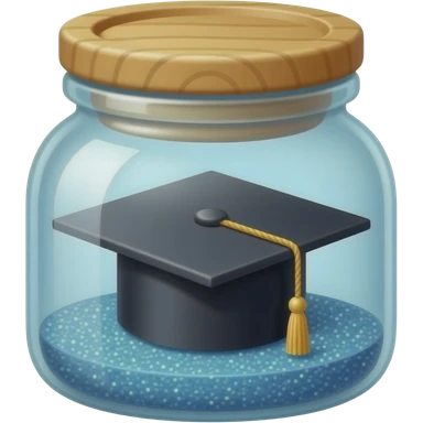 A thin glass jar with glitter inside it and a Graduation cap also inside it that it being held by a string that is attatched to the wooden cap of the jar emoji