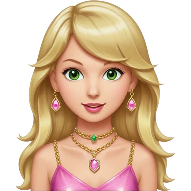 Green eyed smiling Taylor swift with long hair wearing a sparkly pink minidress a pink and goldchoker with gold gemstone chains at the eras tour emoji