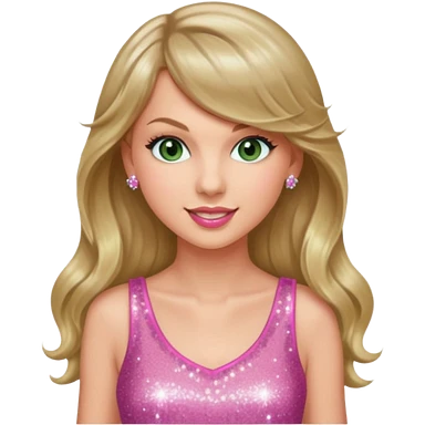Green eyed smiling Taylor swift with long hair wearing a sparkly pink minidress at the eras tour emoji
