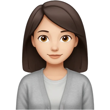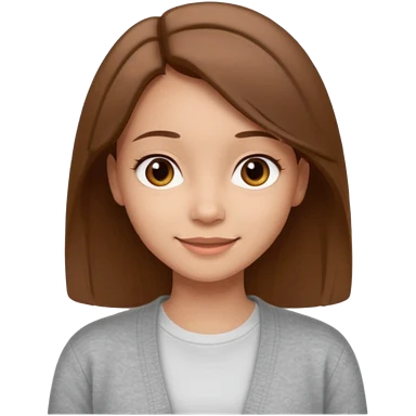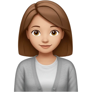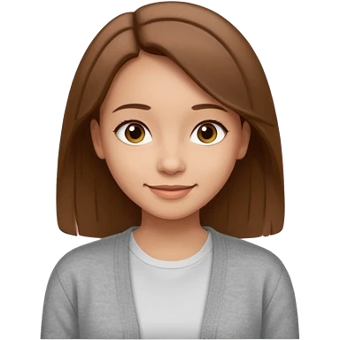The girl has straight medium-length dqrk brown hair, light skin, wearing a white t-shirt and gray cardigan. Gentle smile, friendly neutral expression emoji | AI Emoji Generator