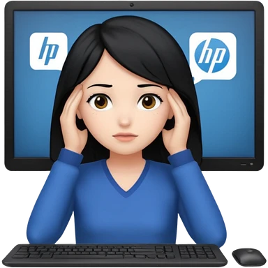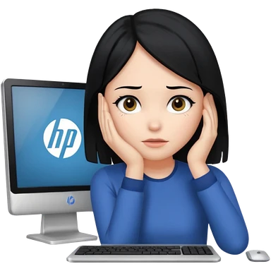 A girl is in front of a computer and is holding her head.The one with black hair And the computer is of a certain type hp emoji