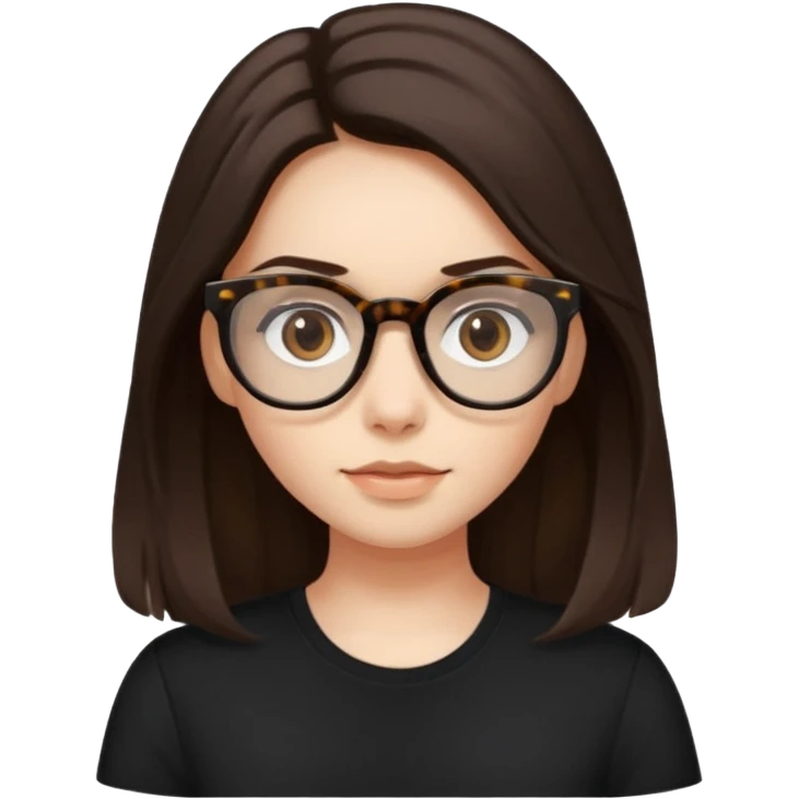 The girl with dark brown long hair, white skin, brown dark eyes, wearing black shirt and tortoise framed glasses emoji | AI Emoji Generator