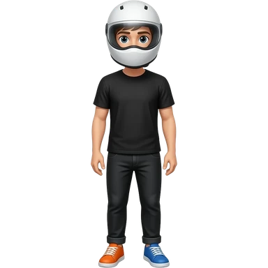 a young man in black t-shirt and a black pants wearing a white helmet with unvisible vision, the right shoe is colored blue and the left shoe is colored orange emoji