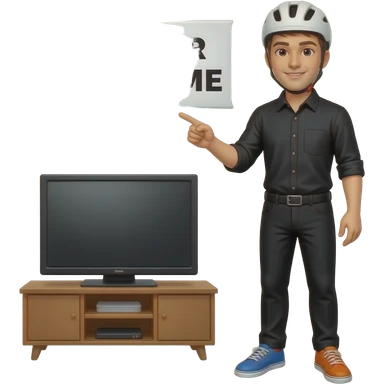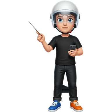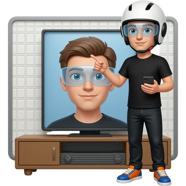 a young man in black t-shirt and a black pants wearing a white helmet with unvisible vision, the right shoe is colored blue and the left shoe is colored orange, the right hand holds a pointer and the left hand is holding a handy, he stand in front of a tv emoji