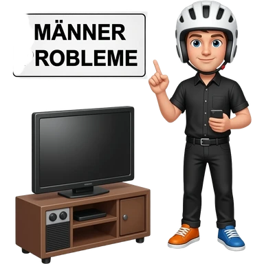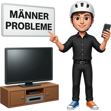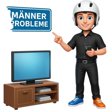 young man in black shirt and black pants wearing a white helmet, the right shoe is colored blue and the left shoe is colored orange, the right hand holds a pointer and the left hand is holding a handy, he stand in front of a tv and a sign with MÄNNER PROBLEME written on it is seen emoji