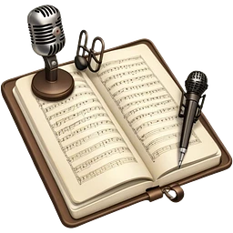 Create an emoji representing songwriting. The design should feature an open notebook or sheet music with visible lyrics and musical notes, symbolizing the process of writing song lyrics. A pen or pencil should be placed near the notebook, indicating active writing. Optionally, include a vintage microphone or a quill to add a creative touch. Use a harmonious color palette with warm and neutral tones. Do not include any emojis or smiley faces. Make the background transparent. emoji