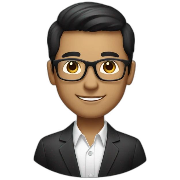 The person in the image has short, dark hair and a clean-shaven face. He has a friendly smile and is wearing a black suit and white shirt with square glasses.emoji