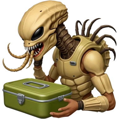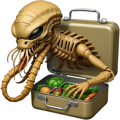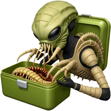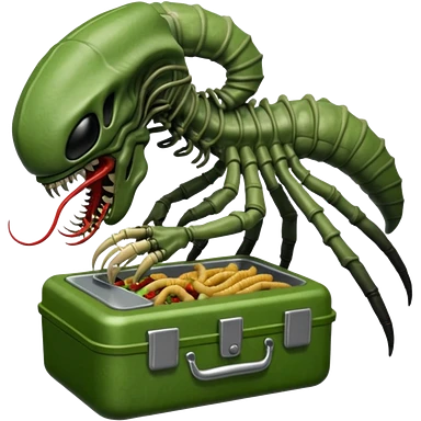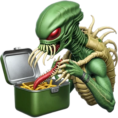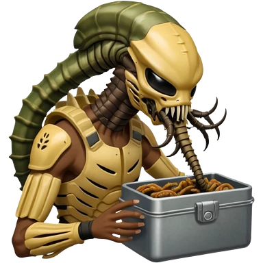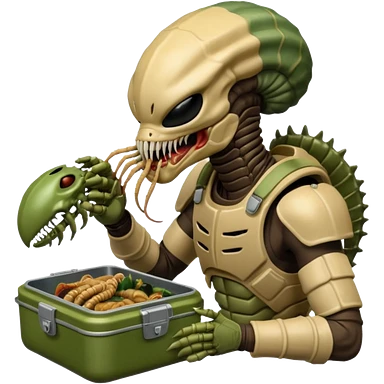 The original Predator with mask and mouth piece eating an Alien facehugger from a lunchbox, the setting should be dark and real. emoji