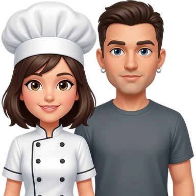 can you take the chefs jacket off, make her taller than him and put the hoops on him? plus shorter hair for him emoji