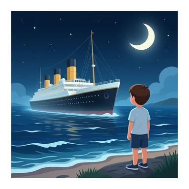 The ghostly ship Titanic hovers above the sea as a boy on the shore watches the scene emoji