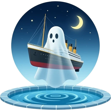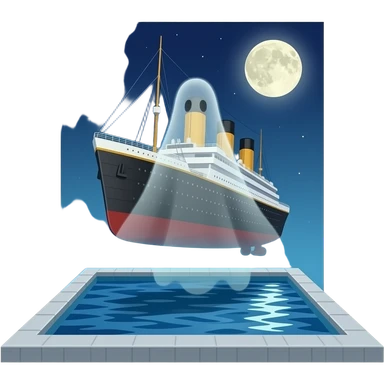 the ghostly ship Titanic hovers in the night sky above a pool of water emoji