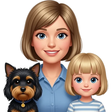 very dark blonde bob haircut 38 years old with little black dog shiatsu with long hair in the eyes and 2 years daughter with very short blonde hair like a boy cut emoji