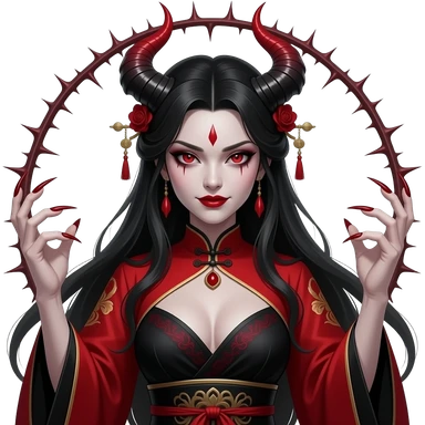 Sammanakha, the demonic female villain, seductive but terrifying face, sharp nails, venomous aura, dramatic red and black traditional attire, vengeful expression, thorny background. emoji