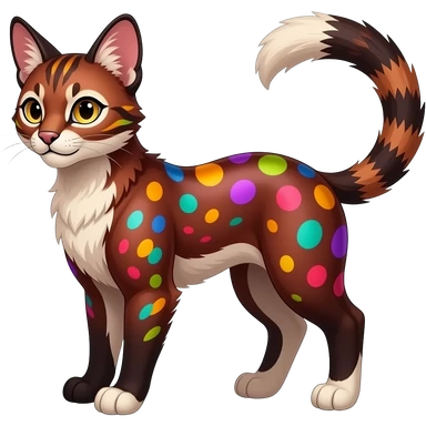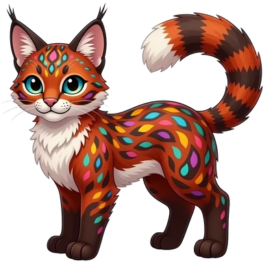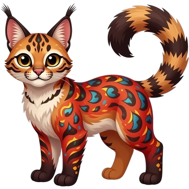 Vibrant-colored red-dark-brownish-furred colorful painted marked patterned Asian glorious divine exotic cute cool beautiful shiny beautiful fantasy-caracal-civet-genet-sergal-vernid-Cacomistle-oncilla-animal-Fakémon-hybrid-fursona (full body) emoji