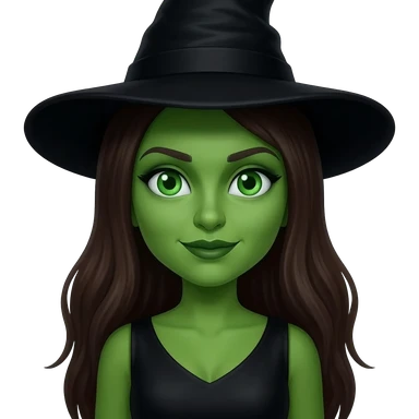 The Wicked Witch from The Land of Oz with green eyes, green skin, long dark brown hair, black dress, black hat emoji