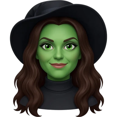 The Wicked Witch from The Land of Oz with green eyes, green skin, long dark brown hair, black turtlneck dress, black witch hat emoji