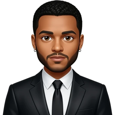The Weeknd with dark brown eyes, black medium afro hair, black metallic shirt, black metallic suit jacket, silver short earrings emoji
