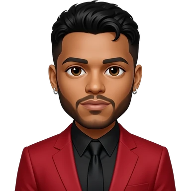 The Weeknd with dark brown eyes, black hair, black metallic shirt, red metallic suit jacket, silver short earrings emoji
