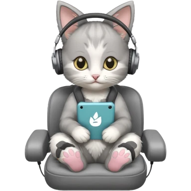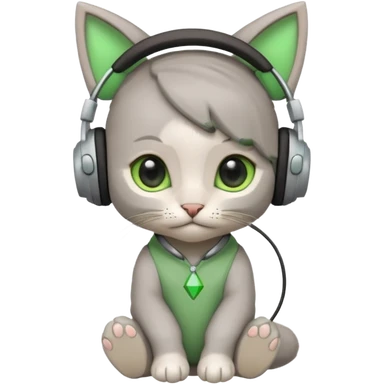 a small little grey kitten sitting on a seat and wearing headphones and there is a sims logo over her head emoji