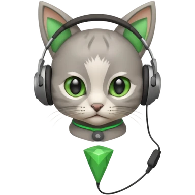 a small little grey kitten sitting on a seat and wearing headphones and there is a green rhombus over her head emoji