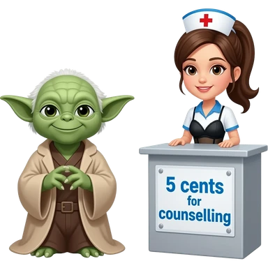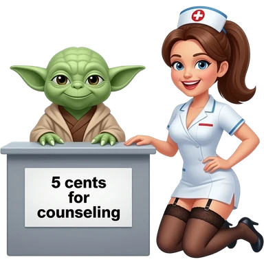 Yoda sitting at a help booth , 5 cents for counseling sign, sitting in front of a nurse ,brunette with pony tail, wearing garter belts , and black lingerie, kneeling and smiling emoji