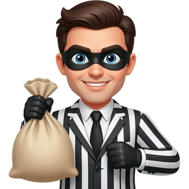 thief emoji in a striped black and white suit, holding a sack, mischievous look emoji