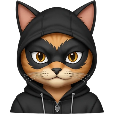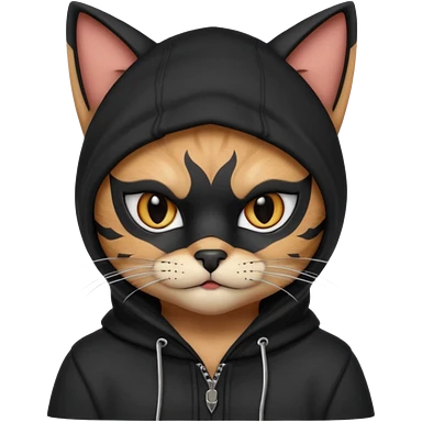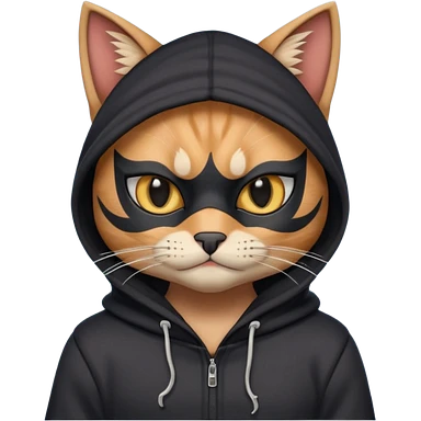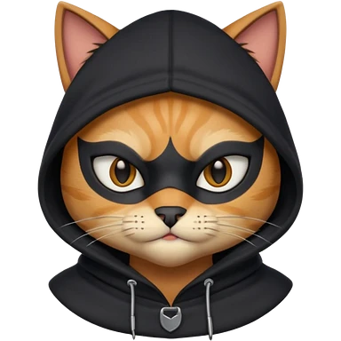 thief cat portrait, head and shoulders only, black mask markings, sly eyes, dark hoodie collar, mischievous expression, 3D cartoon, mobile game icon style, clean background, no text, no watermark emoji